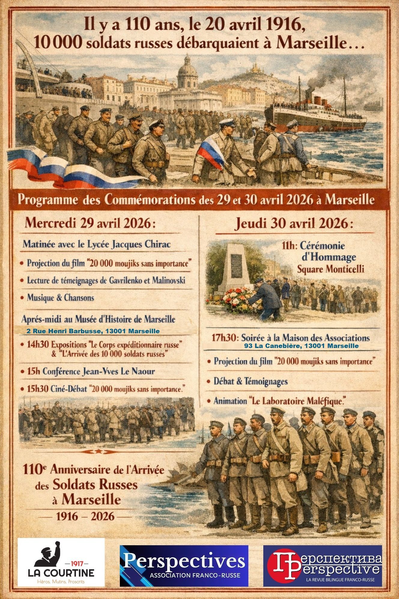 Le 20 avril 1916, à 14 heures, les navires de la 1re brigade du corps expéditionnaire russe venaient mouiller dans le port de la cité phocéenne. Arrivés au cours de la Première Guerre mondiale pour renforcer le front français en Champagne, les soldats furent accueillis en sauveurs et invités par les autorités à défiler dans la ville. Ils empruntèrent le cours Belsunce, la rue de Rome, la place et la rue Saint -Ferréol, la Canebière et la rue de la République. Le journal Le Petit Marseillais relata ainsi l’évènement : Les curieux qui s’écrasent aux fenêtres, au bord de la chaussée, aux terrasses des cafés, ne se lassent pas d’applaudir. Des gerbes de fleurs volent en l’air, des chapeaux, des mouchoirs s’agitent : mille cris fondus en une immense clameur s’élancent des poitrines. Pour ce 110e anniversaire du débarquement des soldats russes, l’association La Courtine 1917 et l’association franco-russe Perspectives organisent les 29 et 30 avril prochains, une série d’initiatives auxquelles sont invités à participer les Marseillaises et les Marseillais.