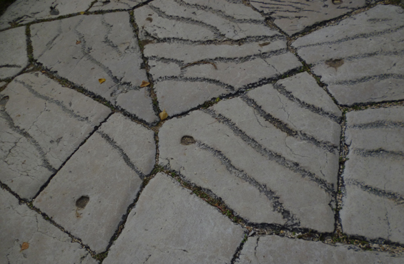 Dallage de la voie romaine à l’entrée de la ville antique de Marseille. Les blocs de dallage, ici en remploi, présentent des stries réalisées volontairement afin de réduire les risques de glissement sur le calcaire. Les petits trous correspondent aux trous de louve ayant permis de soulever ces blocs. IIe siècle après J.-C.