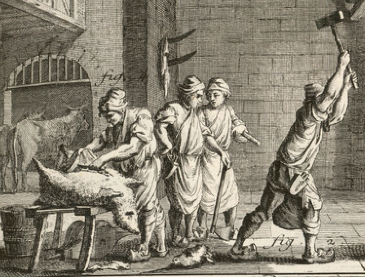 Pour faire du cuir, il faut des peaux et, l’une des premières opérations à accomplir à la tuerie consistait à dépecer le bœuf ou le mouton. Pour ce faire, l’on ouvrait la gorge du bœuf pour le saigner, puis on pratiquait une fente dans la peau du ventre par laquelle on introduisait « la tuyère d’un soufflet » pour en détacher la peau, explique Jacques Lacombe (Encyclopédie des Arts et métiers mécaniques, 1782). Sur l’extrait de la planche de l’Encyclopédie de d’Alembert et Diderot ci-dessus publiée, le boucher vient de terminer l’opération (le soufflet est posé sous l’établi) et il s’apprête à ouvrir la peau pour « écorcher » le mouton. Toutefois, en 1720, « l’usage ordinaire » était à Marseille de « souffler les bœufs et les moutons » « avec la bouche ». Ceci explique-t-il cela ? Il mourut quatre cents personnes à l’abattoir, avance le Père Giraud, et celui-ci fut complètement abandonné par les bouchers à partir du mois d’août. Les bouchers étaient rentrés chez eux et s’y étaient infectés au contact de leurs familles. Les autorités durent faire appel aux forçats pour les remplacer (Publication #57). D’août 1720 à août 1721 se succédèrent les ordonnances visant à réglementer les pratiques en vue d’une amélioration de l’hygiène. Le 20 août 1720, l’échevinat avait ordonné d’utiliser un soufflet pour « enfler les boeufs », sous peine de mort en cas de contravention à la mesure.