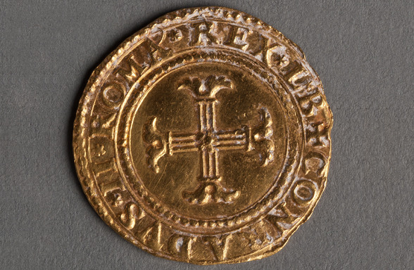Double florin de la république de Gênes émis en 1580. Cette monnaie en or célèbre Conrad II, qui, en tant que roi de Rome et empereur germanique, a permis à la ville de Gênes de battre monnaie en 1139.