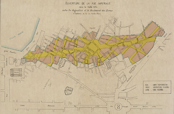 Plan figurant l’ouverture de la rue Impériale (aujourd’hui rue de la République) opérée en 1860-1864 à travers les vieux quartiers de Marseille afin de relier le Vieux Port à celui, nouveau, de la Joliette. Lithographie de Gravière datée de 1860 environ.