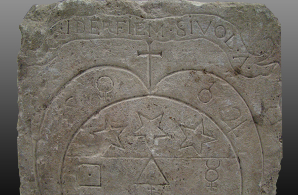 Pierre tombale datée de 1716 et gravée d’inscriptions et de symboles cabbalistiques. Le nom du défunt, Louis Meifredi, est notamment écrit à l’envers, dans le phylactère supérieur. Comme ailleurs dans le royaume de France, le siècle des Lumières à Marseille entremêle les sphères savantes, hermétiques et religieuses.